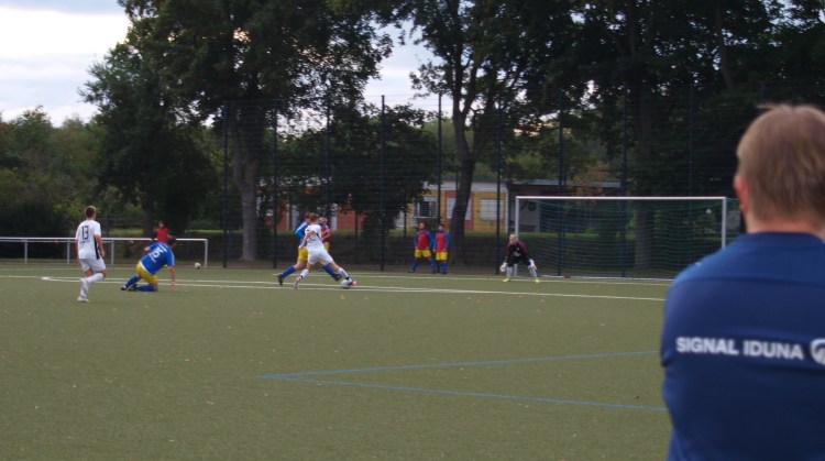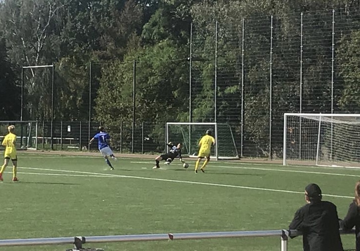 Lukas Winkhaus, der eine sehr überzeugende Leistung gezeigt hat, wurde lang in den Lauf gechickt. Er dribbelte mehrere Abwehrspieler geschickt aus und schoß ganz geschmeidig das 1:0 zu für den Wambeler SV in der 56. Minute.